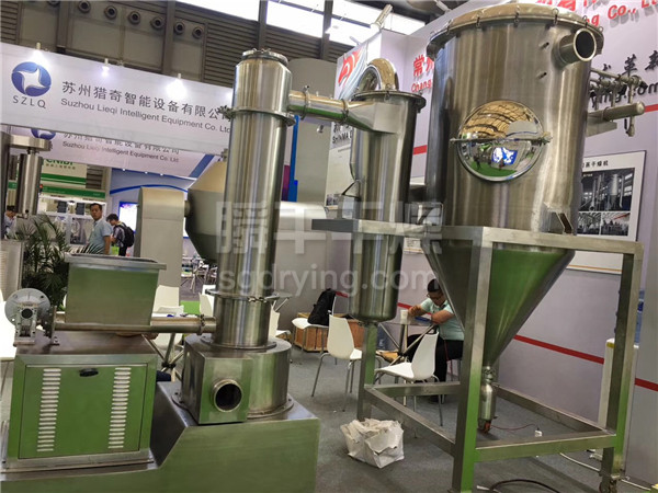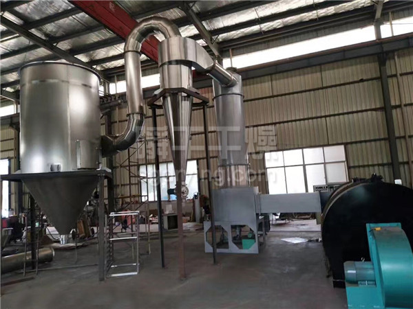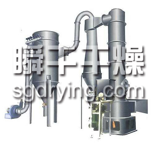 热空气切线进入干燥器底部,在搅拌器带动下形成强有力的旋转风场。膏状物料由螺旋加料器进入干燥器内,在高速旋转搅拌桨的强烈作用下,物料受撞击、磨擦及剪切力的作用下得到分散,块状物料迅速粉碎,与热空气充分接触、受热、干燥。脱水后的干物料随热气流上升,分级环将大颗粒截留,小颗粒从环中心排出干燥器外,由旋风分离器和除尘器回收,未干透或大块物料受离心力作用甩向器壁,重新落到底部被粉碎干燥。