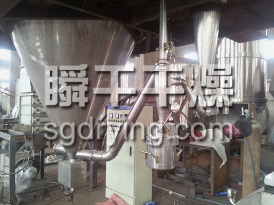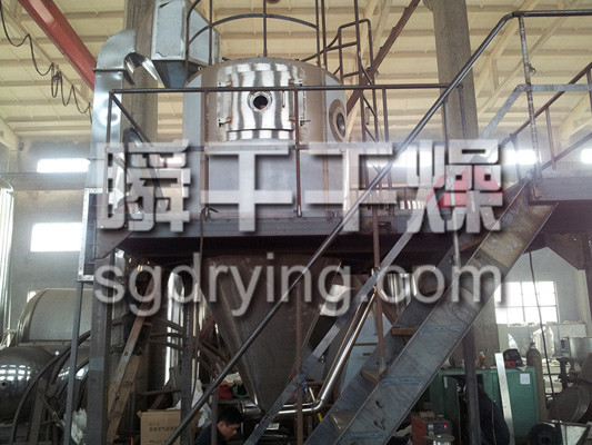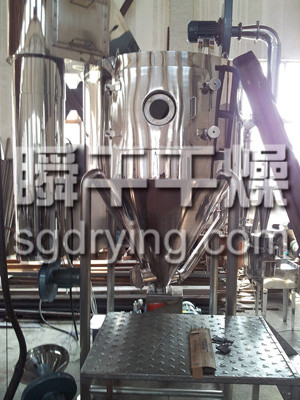 该机采用全封闭形式,所有部件均采用不锈钢制造,配有三级净化装置,过滤后的空气达十万级要求。筒体与顶部装有冷壁装置,使壁温<80℃,干燥塔内装有气刷扫塔装置。经该机干燥后的中药浸膏粉,不会出现焦化变质现象,大大增加了收粉率(95%以上),而且不会产生混药现象和粘壁现象。
