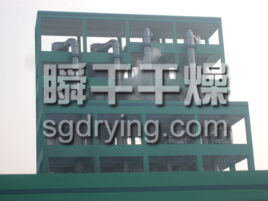本机组工作过程为料液通过隔膜泵高压输入,喷出雾状液滴,然后同热空气并流下降,大部分粉粒由塔底排料口收集,废气及其微小粉末经旋风分离器分离,废气由抽风机排出,粉末由设在旋风分离器下端的授粉筒收集,风机出口还可装备二级除尘装置,回收率在96-98%以上。
