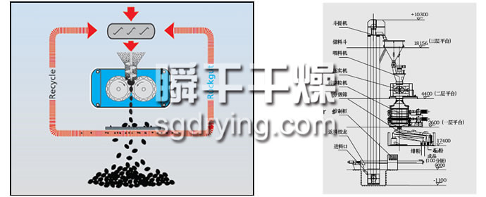 对辊式挤压造粒的工艺原理是:干物料在压力作用下团聚成致密坚硬的大块(饼料),称为挤压过程;饼料再被破碎筛分后成为颗粒料称为造粒过程。挤压的作用一是将颗粒间的空气挤掉,另外是使颗粒间距达到足够近,以产生如范德华力、吸附力、晶桥及内嵌连接等吸引力。挤压造粒的颗粒主要是靠分子之间的作用力形成的颗粒强度。