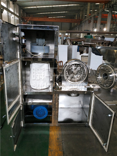 本机组利用活动齿盘和固定齿盘间的相对运动,使物料经齿冲击、摩擦及物料彼此间;冲击而获得粉碎。粉碎好的物料经旋转离心力的作用自动进入捕食袋,粉尘由吸尘箱经布袋过滤回收。该机按“GMP”标准设计,全部用不锈钢材料制造,生产过程中无粉尘飞扬。且能提高物料的利用率,降低企业成本,目前已达到国际先进水平。