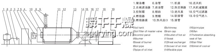 燃料通过燃烧器燃烧,产生高温燃气。并借助具有强化换热措施的热风炉将高温燃气的热量传导给被加热的空气,高温燃气经热量散发后温度降低至250℃后排到大气中。需加热的空气通过选配的鼓风机强送入热风炉,吸热后温度升至额定值从热风出口处送出,当热风温度达到额定温度上限时,燃烧器会自动停止燃烧或自动转为小火焰燃烧,当热风温度降低到额定下限温度时,燃烧器又会重新点燃运行或转为大火燃烧,升温的速度可以调节进风阀的开度来实现。