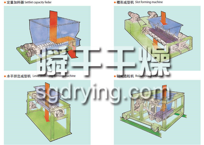 ◎水平挤出成型机: 由加料斗、二根辊子和U形振动网构成。以增大物料的表面积为目的,造粒物料与振动网接触,由旋转辊子的强制压力挤出网外,形成圆柱形的颗粒。
