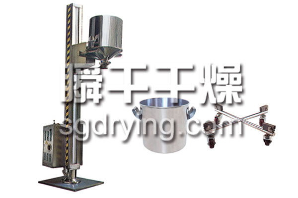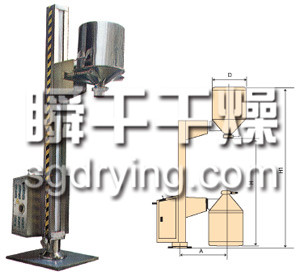 TJG 系列固定提升加料机由两部分组成,即提升机及底座。提升机由机架、液压提升系统及料门翻转机构组成。工作时,先将提升机的料门与料桶扣合,启动提升操作杆,料门与料桶一起上升,启动翻转操作杆,料桶即可番转180度,呈底桶向上姿态并移动到所需位置,利用料门上出料蝶阀,可很容易将物料加入所需的工艺设备中。